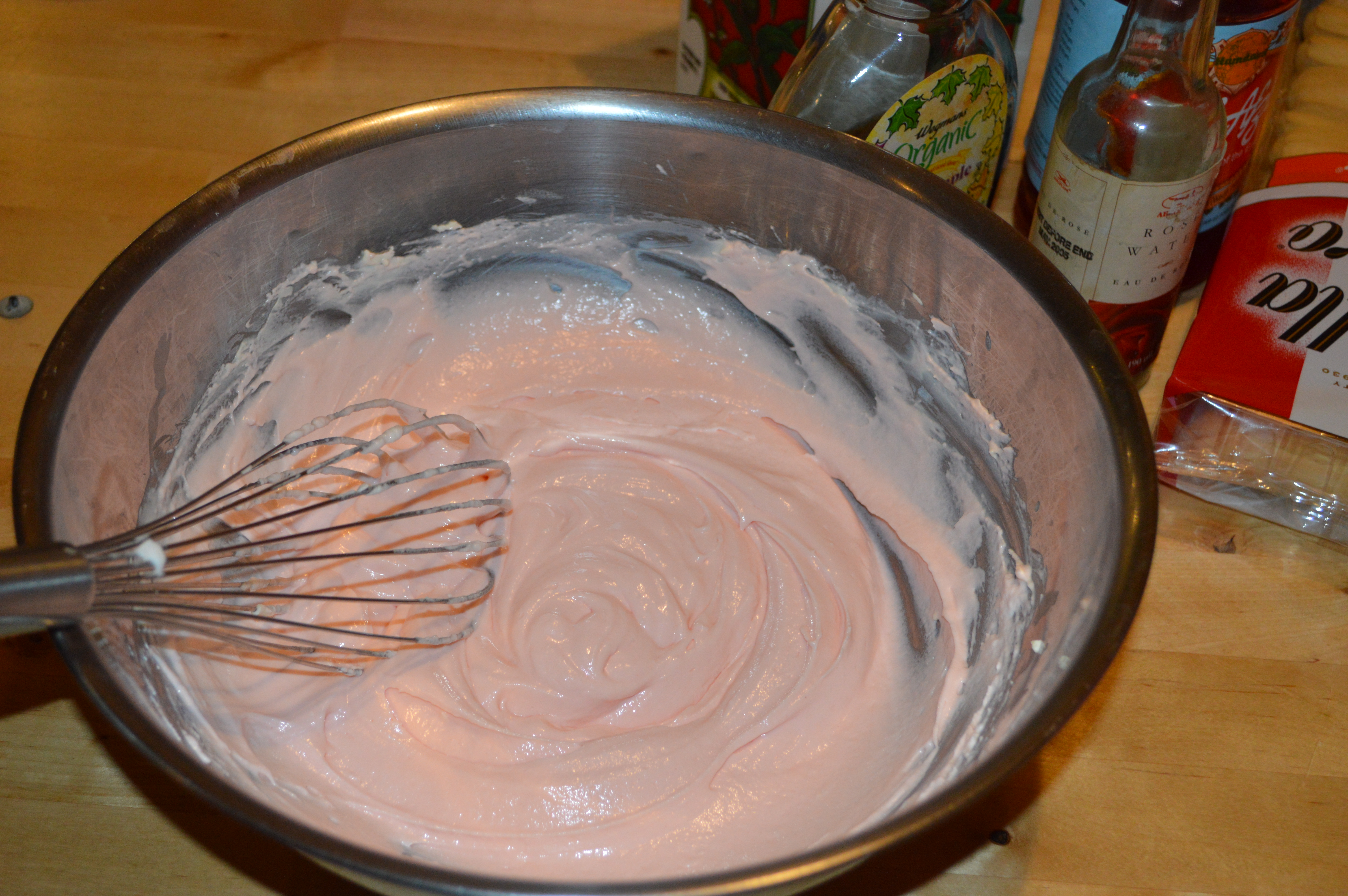 – In a large mixing bowl, combine softened Neufchâtel cheese with maple syrup, almond milk, and rose water and beat till soft peaks can be formed with a spoon