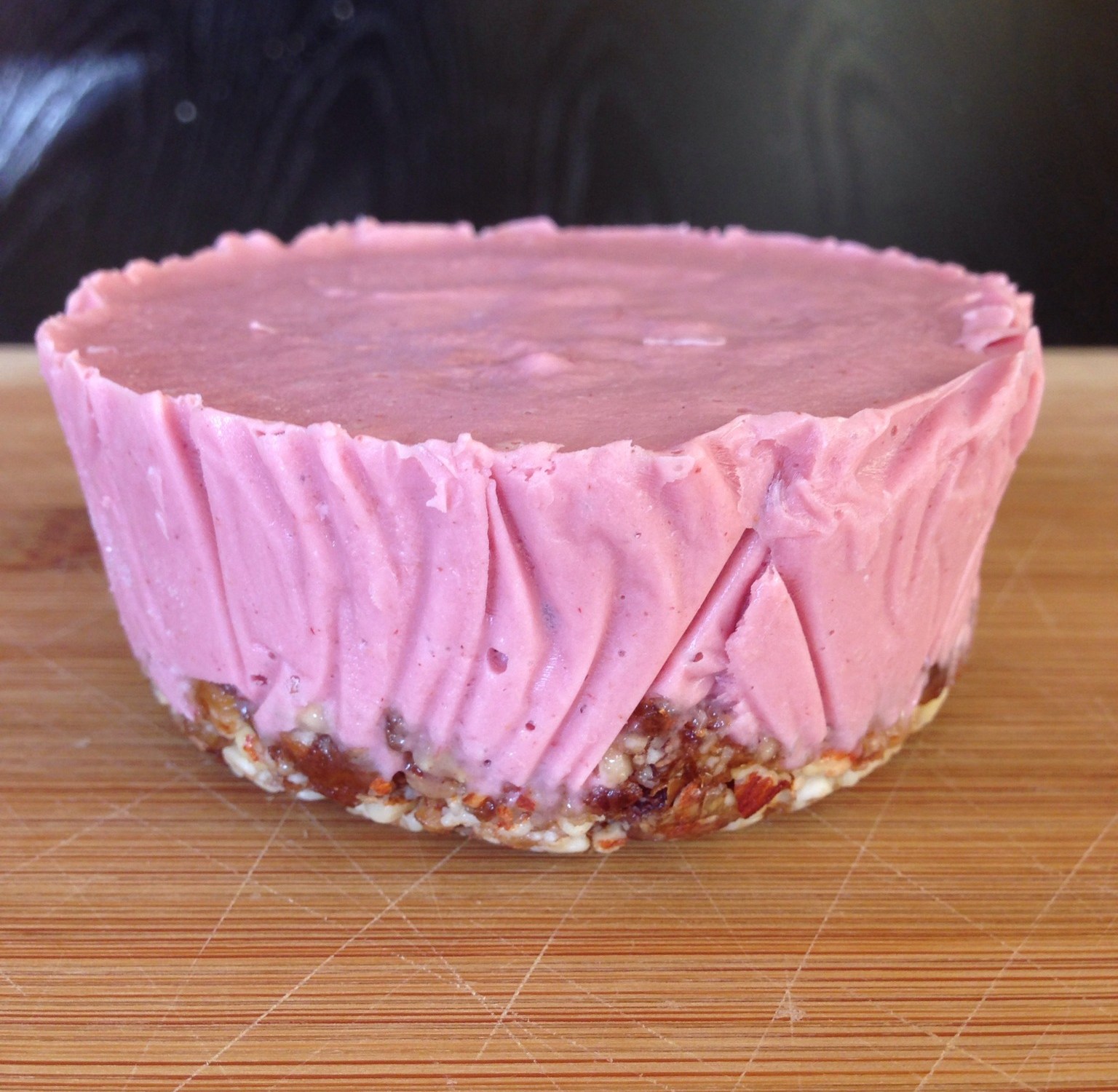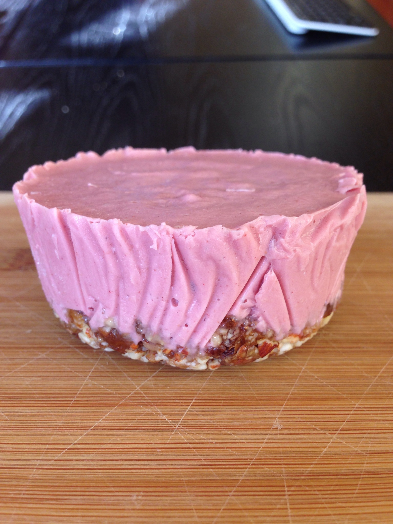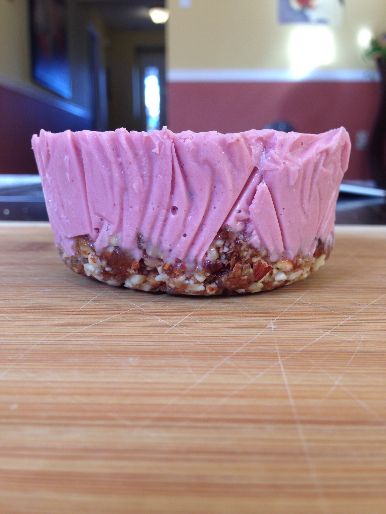 Raw food is my new obsession. I’ve always wanted to make a raw “cheesecake” and finally got around to doing so today! I. am. hooked. Although the cheesecake turned out to be more of an ice cream cake, it tasted amazing nonetheless. Here it is!