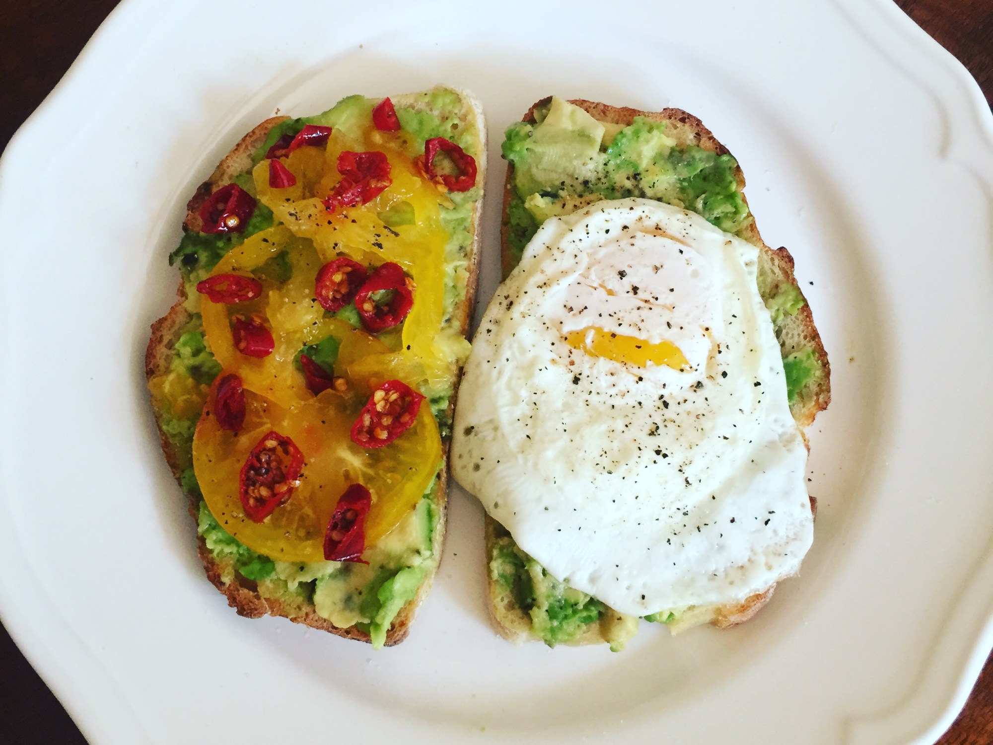 Avocado mashed on a piece of sourdough, with yellow tomatoes (because they’re pretty), calabrian chili peppers, and some salt and pepper on top! The calabrian chili peppers give it this amazing kick..I’m a huge fan!