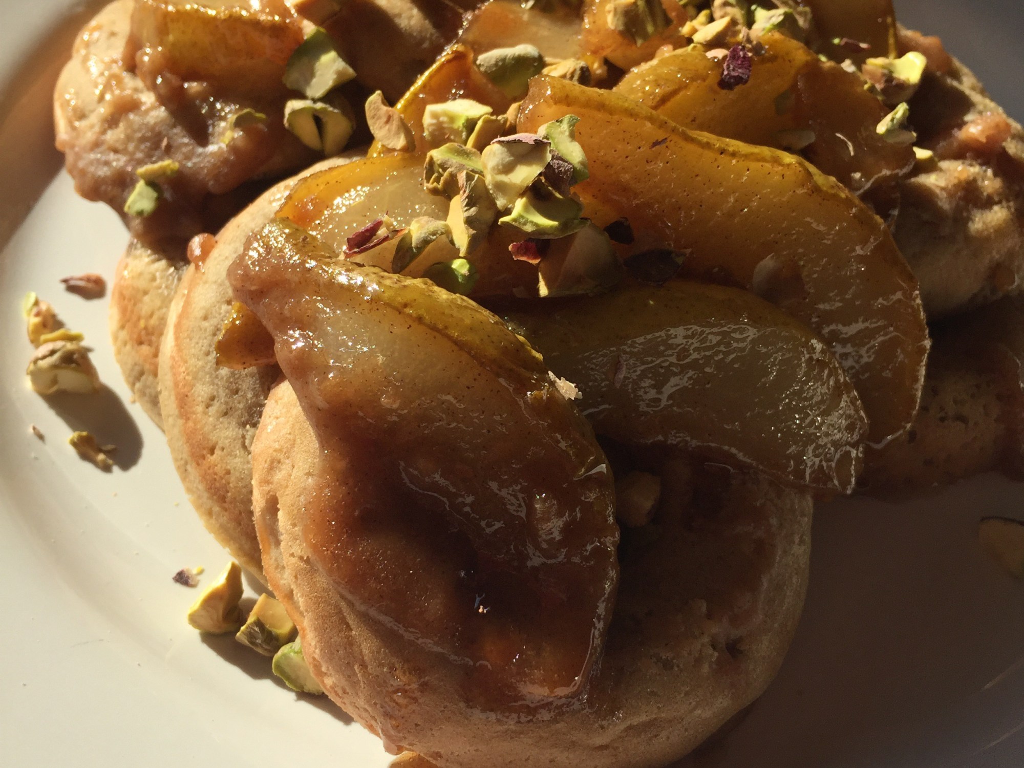 -Pour glaze and pears over donuts and garnish with chopped pistachios